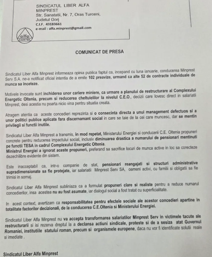 Sindicatul Liber Alfa Minprest anunță că reducerile de posturi din societate se datorează închiderii unor cariere miniere și punerii în aplicare a planului de restructurare al CEO.