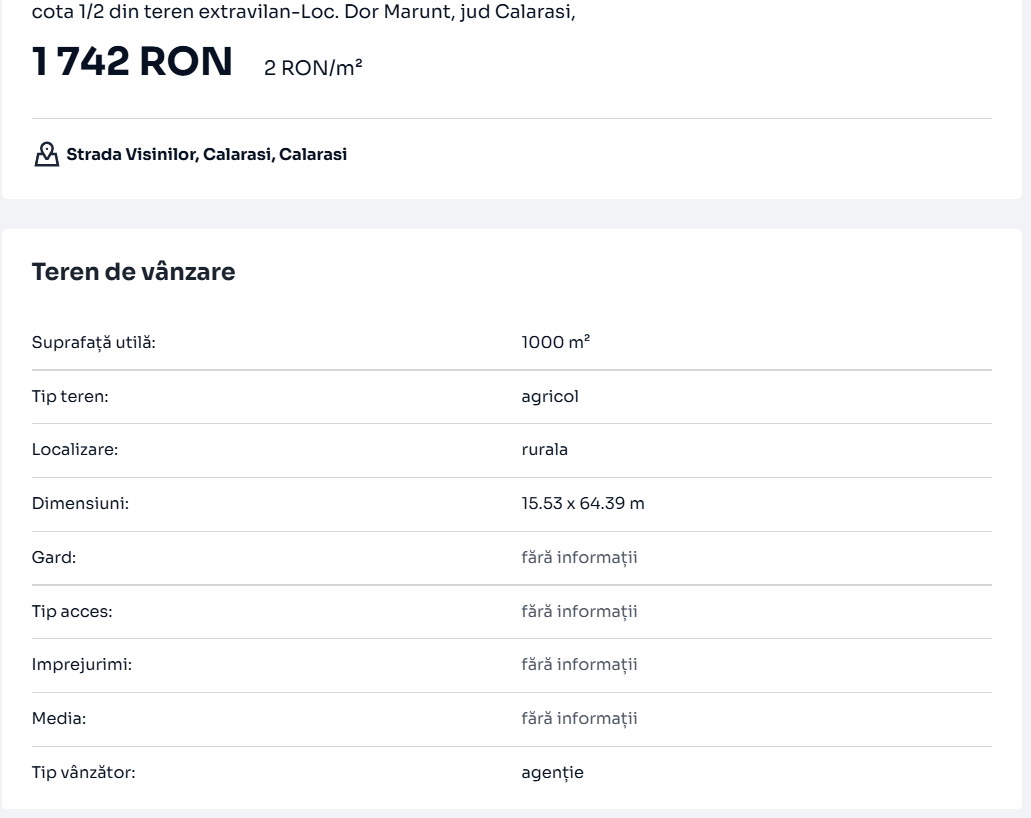 Astfel, potrivit anunțului, oferta este disponibilă în localitatea Dor Mărunt, județul Călărași. Terenul se vinde cu suma totală de 1742 lei pentru o suprafață de 1000 de metri pătrați.