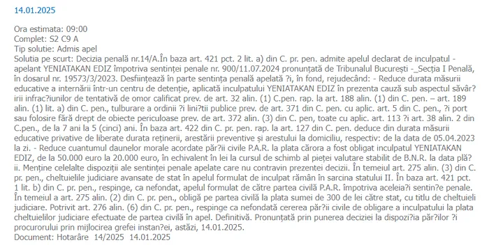 „Soluția pe scurt: (…) admite apelul declarat de inculpatul – apelant YENIATAKAN EDIZ împotriva sentinţei penale nr. 900/11.07.2024 pronunţată de Tribunalul Bucureşti (…).