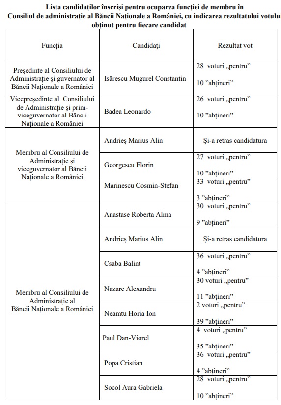 Aviz favorabil: Mugur Isărescu, Leonardo Badea, Florin Georgescu, Cosmin Marinescu, Roberta Anastase, Balint Csaba, Alexandru Nazare, Cristian Popa și Aura Socol.