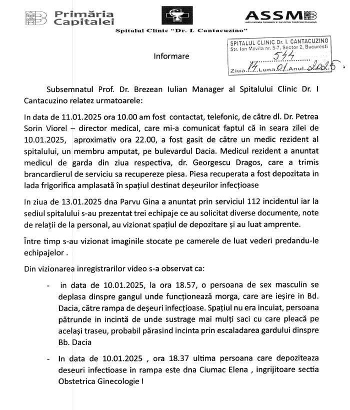 Managerul Spitalului Cantacuzino a transmis, într-un comunicat, că instituția a deschis o anchetă internă, după ce, la data de 11 ianuarie, a fost anunțat că un medic rezident a găsit un picior amputat pe Bld. Dacia. Conducerea instituției a precizat că, incidentul a fost surprins de cadrele de supraveghere ale spitalului, iar principalul suspect este un bărbat.