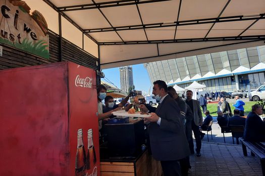 Fumul gros al grătarelor și mirosurile apetisante i-au îndemnat pe cei prezenți să se înfrupte pentru a prinde puteri în perspectiva unei zile de ”luptă” între cei doi candidați – Ludovic Orban și Florin Cîțu – și susținătorii lor.