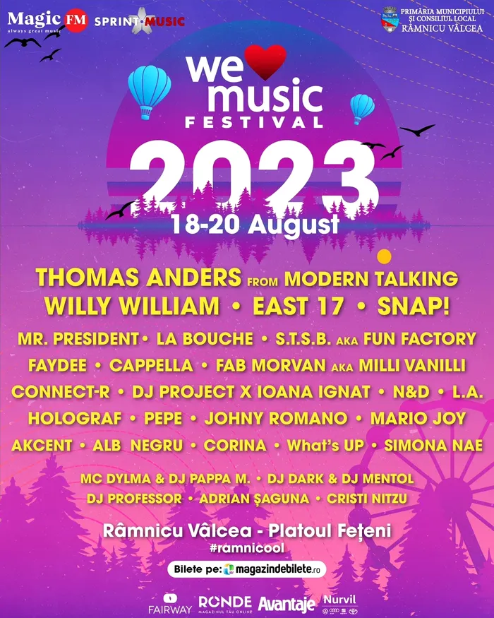 Lista completă a artiștilor care vor urca pe scenă la cea de-a doua ediție We Love Music Festival a fost anunțată! Așa că line-up-ul a fost dezvăluit de către organizatori iar publicul se va bucura pe Platoul Fețeni de la Râmnicu Vâlcea de prezența următorilor artiști: Thomas Anders de la Modern Talking, Willy William, East 17, Snap!, Mr. President, La Bouche, S.T.S.B. aka Fun Factory, Faydee, Cappella, Fab Morvan aka Milli Vanilli, Connect-R, DJ Project x Ioana Ignat, N&D, L.A., Holograf, Pepe, Johny Romano, Mario Joy, Akcent, Alb Negru, Corina, What’s UP, Simona Nae, MC Dylma&DJ Pappa M. DJ Dark & DJ Mentol, DJ Professor, Adrian Șaguna și Cristi Nitzu.
