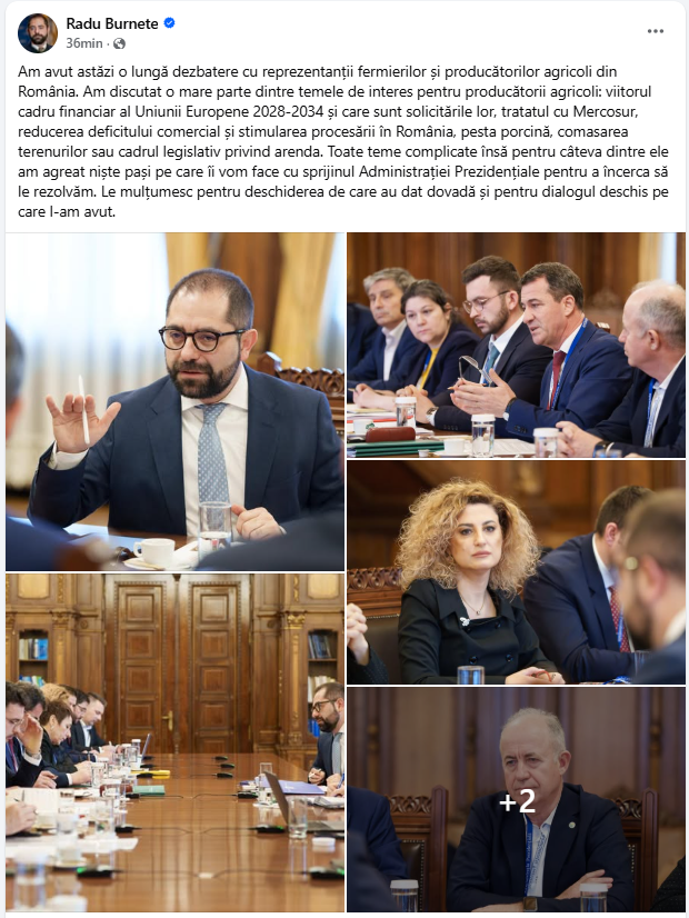 Consilierul prezidențial al președintelui României, Radu Burnete, a transmis un mesaj pe rețelele de socializare după ce s-a întâlnit cu fermierii la Palatul Cotroceni. Discuțiile au vizat principalele probleme ale agriculturii românești, pesta porcină, finanțele UE, dar și acordul Mercosur.