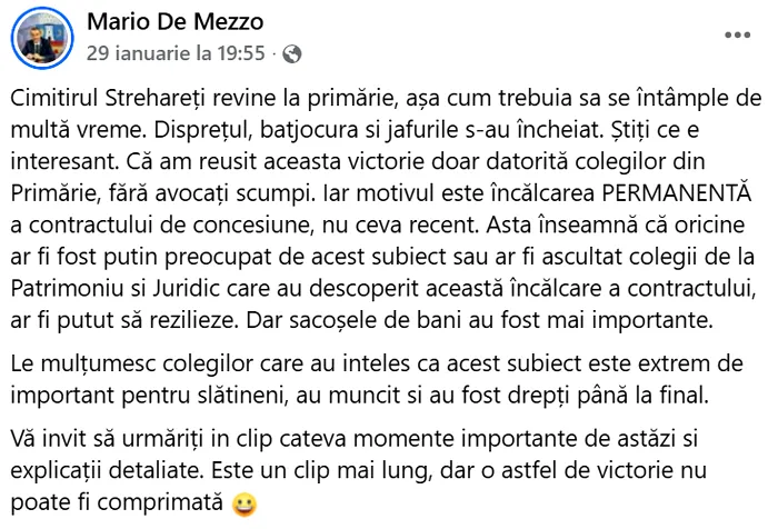 Primarul din Slatina, Mario De Mezzo, ar fi transmis informații false despre preluarea administrării Cimitirului Strehareți, potrivit unei anchete publicate de Gazeta Nouă. Publicația susține că anunțul edilului ar fi avut rolul de a distrage atenția de la scandalul majorării taxelor și impozitelor locale.