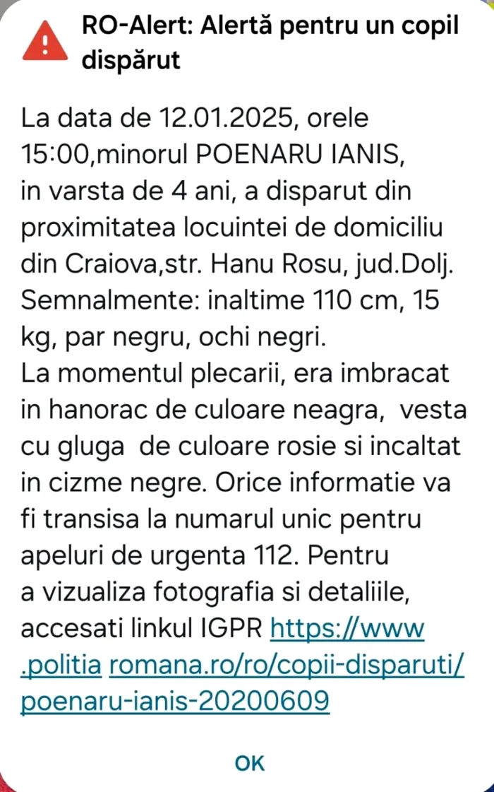 ȘTIRE INIȚIALĂ. ”La data de 12 ianuarie a.c., ora 18.04, Secţia 6 Poliţie Craiova a fost sesizată de o femeie, de 78 de ani, din municipiul Craiova, cu privire la faptul că, nepotul său, POENARU YANNIS, în vârstă de 4 ani, în cursul acestei zile, în jurul orei 15.00 a plecat din faţa locuinţei sale, unde se juca împreună cu alţi copii şi nu a mai revenit până în prezent”, a transmis, duminică seară, IPJ Dolj, potrivit politiaromana.ro