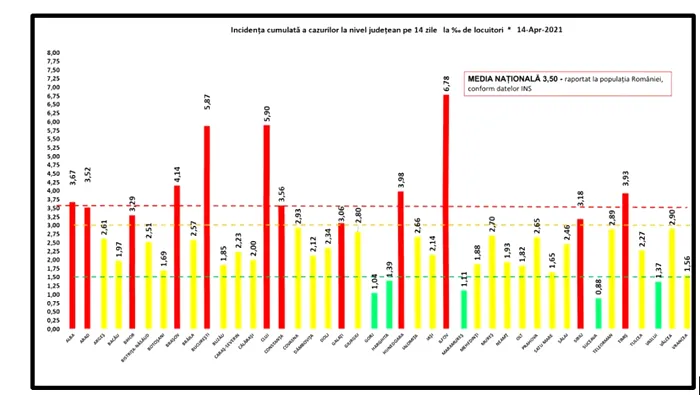 Până pe 14 aprilie 2021, pe teritoriul României, au fost confirmate 4.076 de noi cazuri de persoane infectate cu noul coronavirus COVID-19 din 26.409 teste RT-PCR și 10.797 teste rapide antigenice.