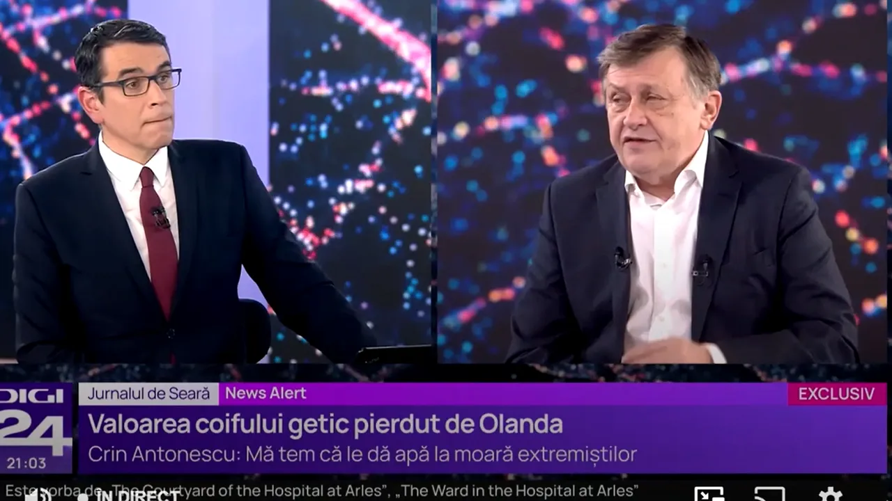„Cu o formulare care ne arată că situația este mai gravă probabil decât ne închipuim, Kelemn Hunor, într-un interviu la B1 spune așa: „Suntem într-un rahat cât casa și nimeni nu reacționează în niciun fel.” La ce fel de rahat se referă Kelemen Hunor, la cel în care candidatul pro rus, extremist, Călin Georgescu, declară într-un interviu de televiziune că are mulți simpatizanți în rândul Serviciilor de Informații și că primește rapoarte pe care le citește. Kelemen Hunor este exasperat că după astfel de mărturisiri nimeni nu reacționează.”, a fost introducerea în subiect făcută de Cosmin Prelipceanu, iar Crin Antonescu a declarat: