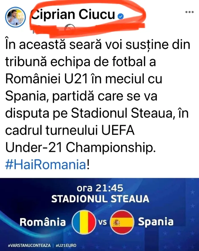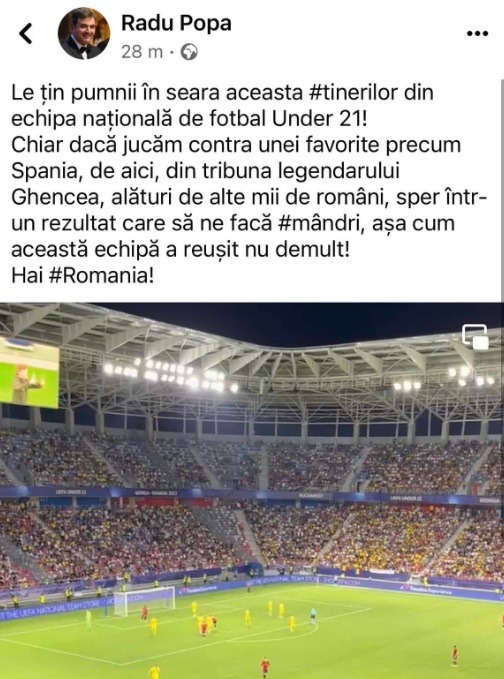„Le țin pumnii în seara aceasta #tinerilor din echipa națională de fotbal Under 21!Chiar dacă jucăm contra unei favorite precum Spania, de aici, din tribuna legendarului Ghencea, alături de alte mii de români, sper într-un rezultat care să ne facă #mândri, așa cum această echipă a reușit nu demult!