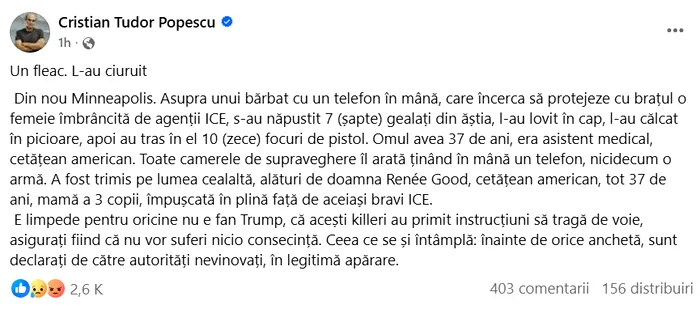 Printr-o postare pe Facebook, jurnalistul Cristian Tudor Popescu a comentat uciderea bărbatului de 37 de ani de către agenți federali ICE și a tras un semnal de alarmă cu privire la brutalitatea intervențiilor și lipsa de responsabilitate a autorităților. El a criticat modul în care agenții au fost declarați nevinovați înainte de încheierea anchetei.