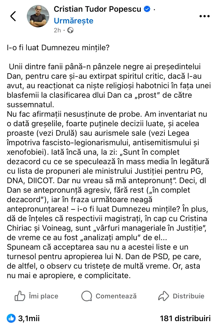Gazetarul Cristian Tudor Popescu a lansat un nou atac dur la adresa președintelui Nicușor Dan, într-o postare pe Facebook în care îl acuză de „complicitate” cu PSD. Jurnalistul critică reacția șefului statului în legătură cu lista de propuneri pentru conducerea marilor parchete și sugerează că poziția acestuia ar indica o apropiere tot mai vizibilă de social-democrați.