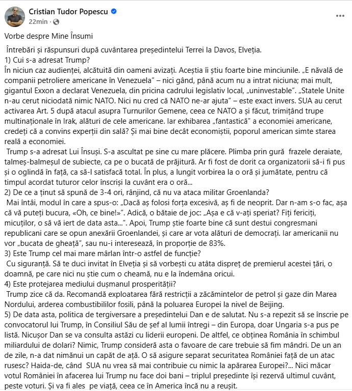 Prin intermediul unei postări pe pagina sa de Facebook, Cristian Tudor Popescu a analizat discursul președintelui american Donald Trump la Davos. Jurnalistul a comentat câteva dintre declarațiile controversate făcute de liderul SUA.