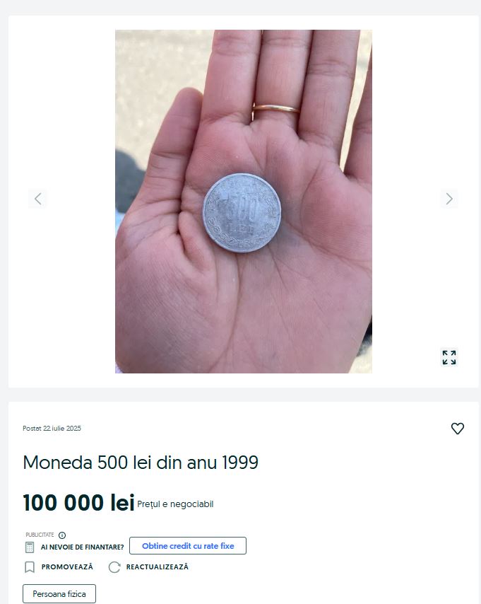 Un utilizator a încărcat pe platforma Olx un anunț prin care oferă spre vânzare o monedă din anul 1999 cu valoarea nominală de 500 de lei. Pentru această monedă, vânzătorul cere 100.000 de lei, prețul fiind negociabil. În cadrul postării, utilizatorul a notat: „Vând monedă de 500 lei din anul 1999. În stare foarte bună. Negociabil”.