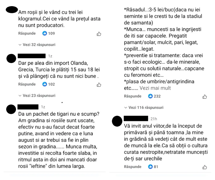 „Dar pe alea din import Olanda, Grecia, Turcia le plătiți cu 15 sau 18 lei și vă plângeți că nu sunt nici bune”, „Dar un pachet de țigări nu e scump? Am grădină și roșiile sunt uscate, efectiv nu s-au făcut decât foarte puține, având în vedere că e luna august și ar trebui să fie în plin sezon în grădină… Muncă multă, investiție și recoltă foarte slabă. În ritmul ăsta, în 2 ani, mâncați doar roșii «ieftine» din lumea largă”, au scris alte două persoane.