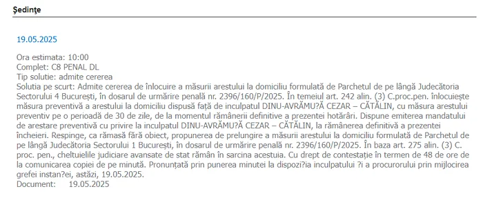 „Admite cererea de înlocuire a măsurii arestului la domiciliu formulată de Parchetul de pe lângă Judecătoria Sectorului 4 Bucureşti, în dosarul de urmărire penală nr. 2396/160/P/2025. (…)