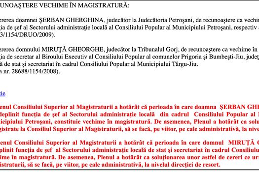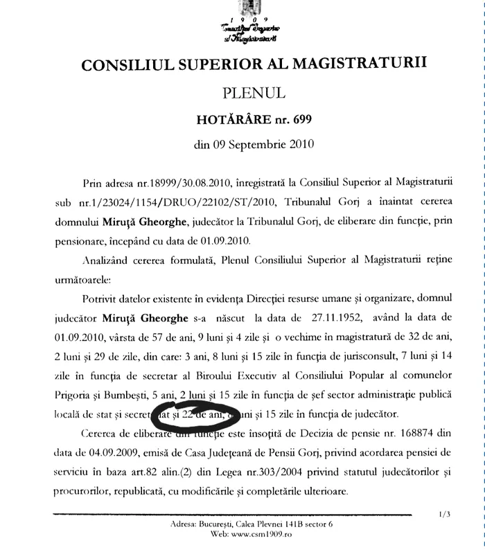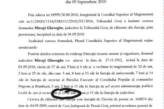 Aceasta explică apoi, pas cu pas, care a fost parcursul lui Gheorghe Miruță în Magistratură și cum a ieșit acesta la pensie: