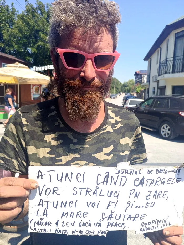 Bărbatul din imagine ar fi lucrat ca și chirurg la Spitalul Fundeni, dar a ajuns să cerșească în Vama Veche, pentru a-și cumpăra o bere. El cere bani purtând o pancartă pe care a scris câteva versuri, din dorința de a-i impresiona pe turiștii care trec pe lângă el.