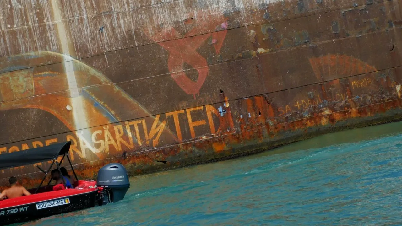 Așa cum se vede într-o serie de fotografii publicate recent pe un grup de Facebook despre Costinești, fosta navă grecească este din ce în ce mai ruginită.