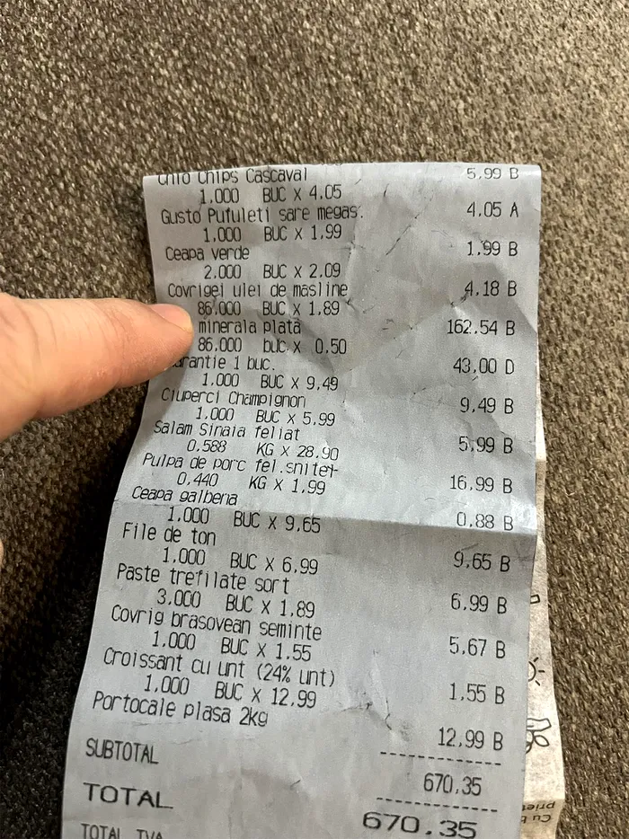Un utilizator a încărcat pe grupul de Facebook „Ești din Iași dacă…” imagini cu bonul fiscal de la unul dintre magazinele LIDL. El a mărturisit că, probabil dintr-o eroare, casiera a marcat o sticlă de apă de 1,89 lei ca fiind 86 de bucăți. În acest sens, calculând cu tot cu garanția de 0,5 lei per sticlă, i-au fost adăugați 205 lei la plata finală. Și-a dat seama abia acasă. S-a întors, a expus problema, iar situația s-a rezolvat.
