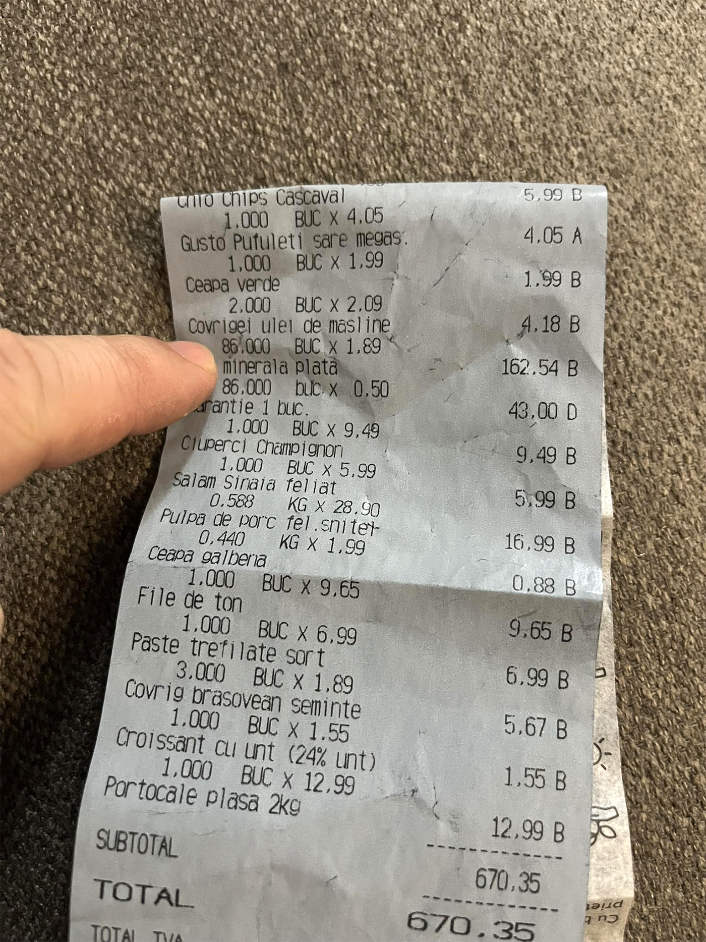 Cum a ajuns un ieșean să plătească 162 lei pentru o singură sticlă de apă la 0.5 litri, în LIDL. Clientul a încărcat o imagine cu bonul fiscal pe un grup de Facebook aferent comunității din Iași. Postarea a stârnit reacții din partea altor utilizatori.