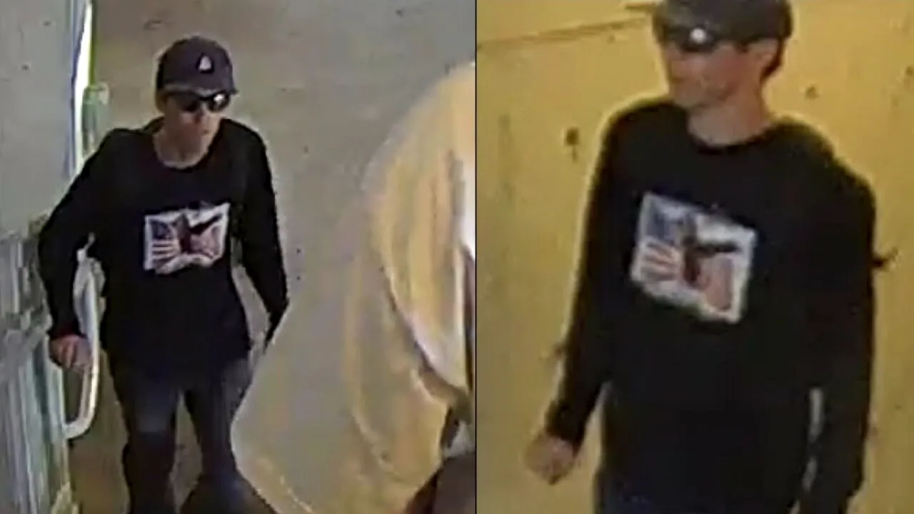 În înregistrare se vede cum suspectul, îmbrăcat în haine închise la culoare, cu glugă în cap, aleargă pe acoperișul unei clădiri, sare de la înălțime și apoi dispare într-o parcare din apropiere.