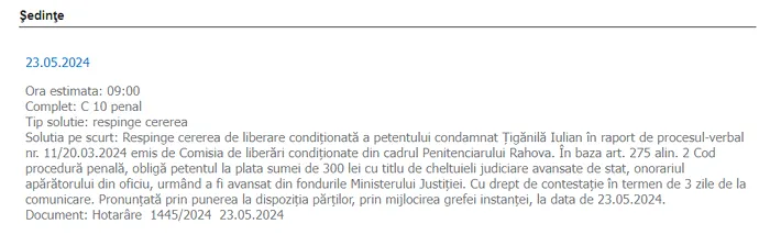 Cum decizia dată în 18 martie 2024 era definitivă și Iulian Țigănilă a stat aproape 25 de ani în închisoare, nu mai era decât un pas până la eliberarea condiționată.