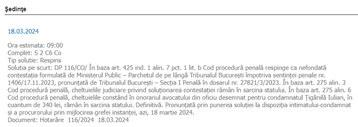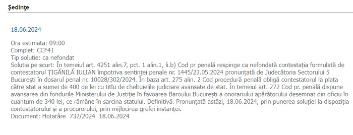 Ținând cond de toți acești factori, contestația lui Iulian Țigănilă a fost respinsă de magistrații de la Tribunalul București, iar decizia a fost una definitivă.