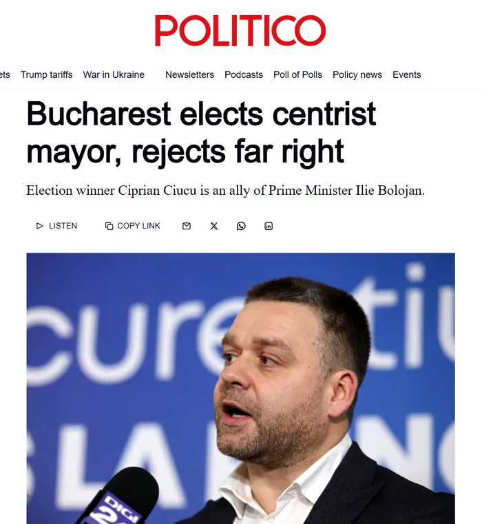 Articolul din Politico pare să evidențieze mai mult victoria împotriva suveranismului, decât victoria lui Ciprian Ciucu la primăria capitalei. Politica din România a fost aruncată în haos după ce un candidat ultranaționalist de pe TikTok a ieșit din obscuritate pentru a câștiga primul tur al cursei prezidențiale din noiembrie 2024, arată publicația.