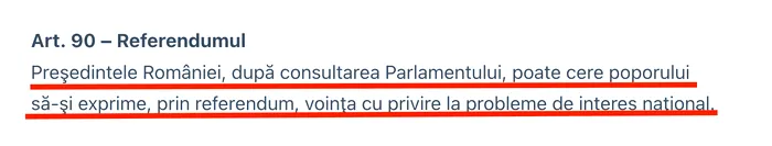 Are.90 din Constituție spune clar că „Preşedintele României, după consultarea Parlamentului, poate cere poporului să-şi exprime, prin referendum, voinţa cu privire la probleme de interes naţional”.