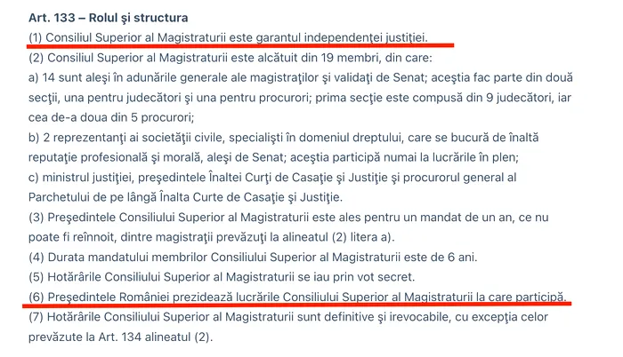 În plus, are 133 din Constituție, declară Consiliul Superior al Magistraturii chiar garantul independenței Justiției. Potrivit alin 6 din același articol, Nicușor Dan poate doar prezida ședințele CSM (lucru pe care nu l-a făcut până acum) și doar atât.