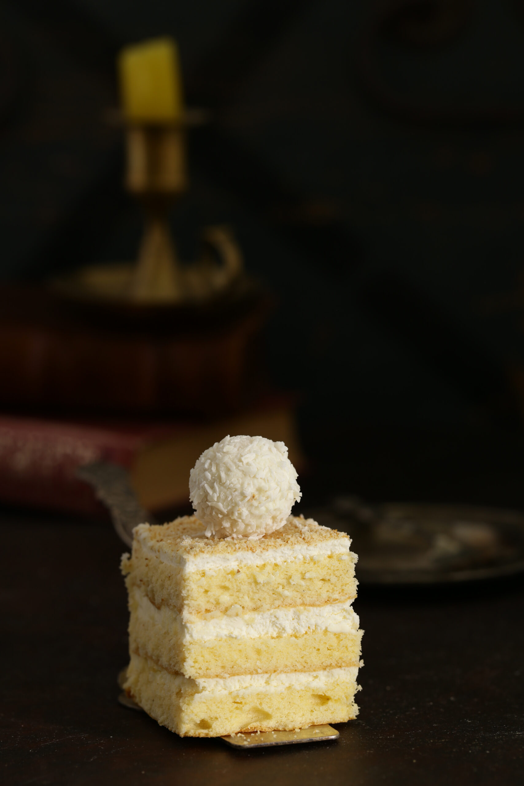 Apoi, prăjitura se ansamblează. Mai întâi, se tapetează tava cu folie de plastic. Se așază prima foaie, se întinde un strat de cremă, apoi se repetă totul și pentru celelalte foi. La final, se întinde crema pe ultima foaie și se presară nucă de cocos. Se împachetează cu folie și se pune un tocător deasupra. Se lasă prăjitura la frigider peste noapte.