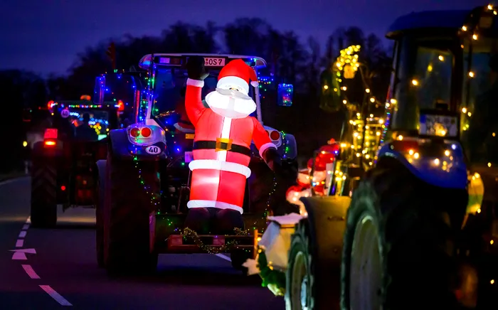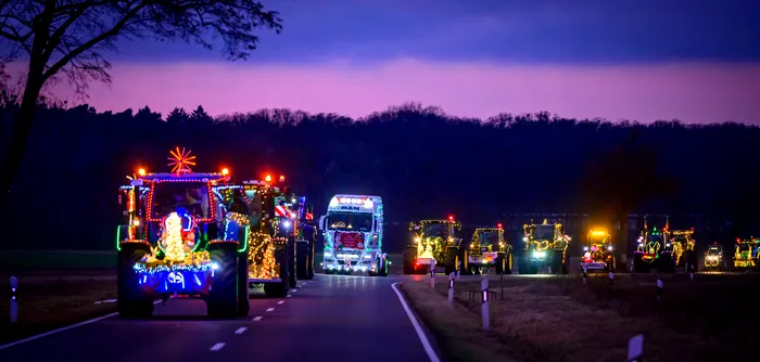 14 December 2025, Brandenburg, Bliesdorf: Participants with their decorated tractors and trucks take part in the Oderland farmers’ pre-Christmas lights tour. On the third Sunday of Advent, the procession traveled from Bliesdorf to Seelow in eastern Brandenburg, with around 70 colorfully decorated and illuminated vehicles covering the 30-kilometer route. Photo: Patrick Pleul/dpa