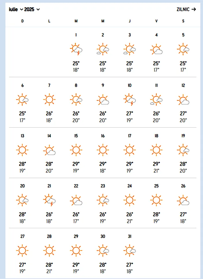 - 28 – 31 iulie 2025, litoral: vor fi între 27 și 29 de grade Celsius, la mare. Temperatura minimă va coborî cu circa 10 grade și se va situa între 18 și 21 de grade Celsius.