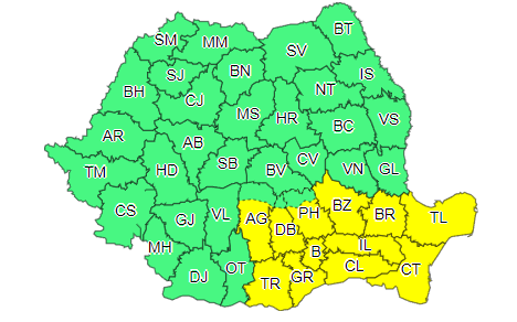 De asemenea, la această oră este în vigoare un cod galben de vânt puternic pentru mai multe județe din sudul țării.