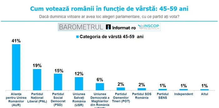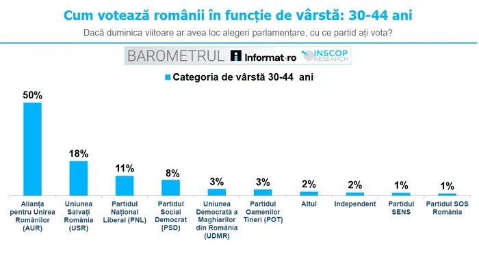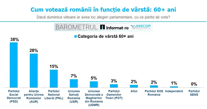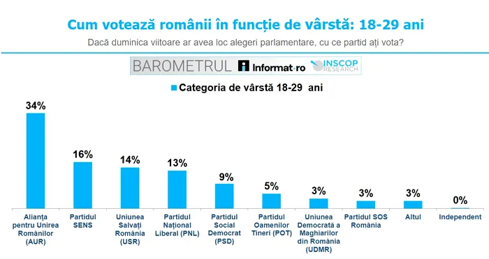 Datele barometrului informat.ro-INSCOP realizat în perioada 25 octombrie – 2 noiembrie, arată că 34% dintre tineri votează cu AUR, SENS și USR. Singura categorie de vârstă unde AUR nu se află pe primul loc în opțiunile de vot pentru parlamentare este cea a persoanelor de peste 60 de ani, care optează în proporție de 38% pentru PSD.