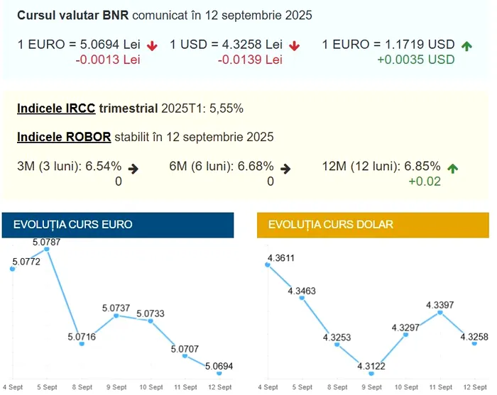 Banca Națională a României (BNR) a actualizat datele pentru ziua de vineri, 12 septembrie 2025. Potrivit informațiilor disponibile pe site-ul oficial, indicele ROBOR la 12 luni (12M) a înregistrat o nouă creștere. Prețul gramului de aur s-a majorat și el, față de ziua precedentă.