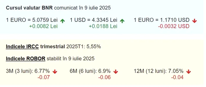 Curs valutar 9 iulie 2025. Datele disponibile pe site-ul Băncii Naționale a României (BNR) au fost actualizate în jurul orei 13:00, inclusiv pentru indicele ROBOR. Conform noilor valori, indicele ROBOR 3M a scăzut cu 0.07 unități. Scăderi au fost înregistrate și pentru indicele 6M și indicele 12M.