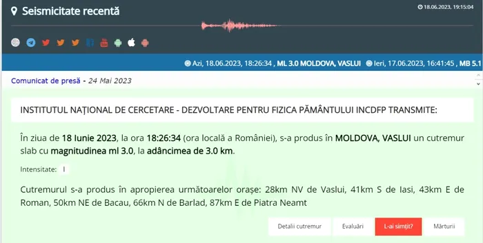 „În ziua de 18 Iunie 2023, la ora 18:26:34 (ora locală a României), s-a produs în MOLDOVA, VASLUI un cutremur slab cu magnitudinea ml 3.0, la adâncimea de 3.0 km.