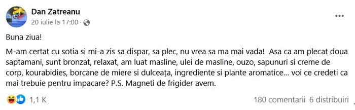 „M-am certat cu soția și mi-a zis să dispar, să plec, nu vrea să mă mai vadă! Așa că am plecat două săptămâni, sunt bronzat, relaxat, am luat măsline, ulei de masline, ouzo, săpunuri și creme de corp, kourabidies, borcane de miere și dulceața, ingrediente și plante aromatice. Voi ce credeți că mai trebuie pentru împacare? P.S. Magneți de frigider avem.”