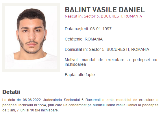 „La data de 16 ianuarie 2023, în urma schimbului de date și informații cu autoritățile din Italia, a fost depistat un bărbat (Daniel Vasile Balint-n.r.), urmărit internațional, căutat în baza unui mandat european de arestare. Pe numele acestuia, Judecătoria Sectorului 6 a emis la data de 6 iunie 2022 un mandat de executare a pedepsei cu închisoarea, prin care a fost condamnat la 3 ani și 7 luni de închisoare, pentru infracțiuni la regimul rutier și nerespectarea măsurilor stabilite prin ordinul de protecție provizoriu. Autoritățile italiene urmează să demareze procedura prevăzută pentru punerea în aplicare a mandatului european de arestare, în vederea predării. Schimbul de date cu autoritățile italiene a fost efectuat de polițiștii Serviciului de Investigații Criminale din cadrul Poliției Capitalei prin intermediul atașatului român din Italia și prin Centrul de Cooperare Polițienească Internațională – Biroul SIRENE”, a transmis Poliția Româna, prin intermediul unui comunicat.