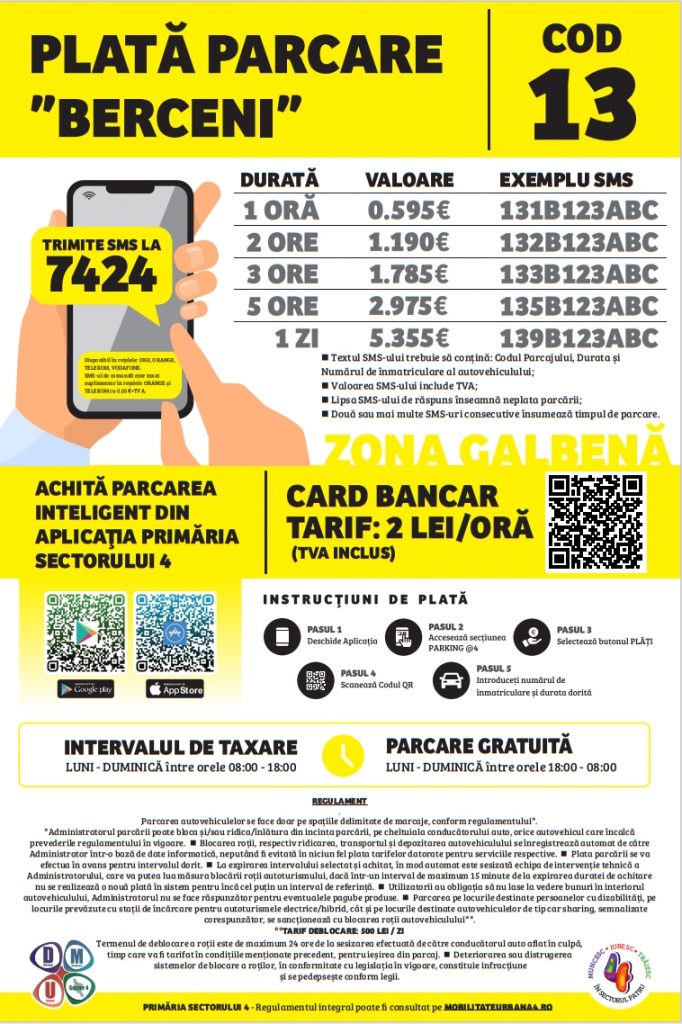 Sursa citată mai menționează că șoferii vor fi informați în legătură cu acest regim de tarifare prin pancartele care vor fi montate în zonele respective, unele cu galben, celelalte cu verde, iar intervalul de taxare va fi de luni până duminică între orele 8-18, în rest fiind gratuit. Plata parcării se poate face extrem de simplu, prin SMS la numărul 7424 sau folosind aplicația Primăria Sectorului 4.
