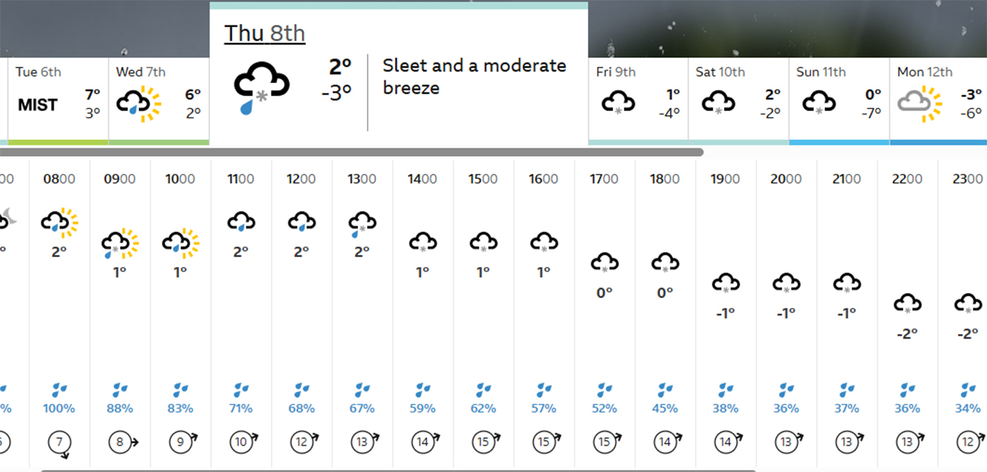 Vremea se va menține rece și luni, 12 ianuarie 2026. Potrivit meteorologilor BBC Weather, temperatura maximă se va situa la -3 grade Celsius, iar temperatura minimă va ajunge la -6 grade Celsius.