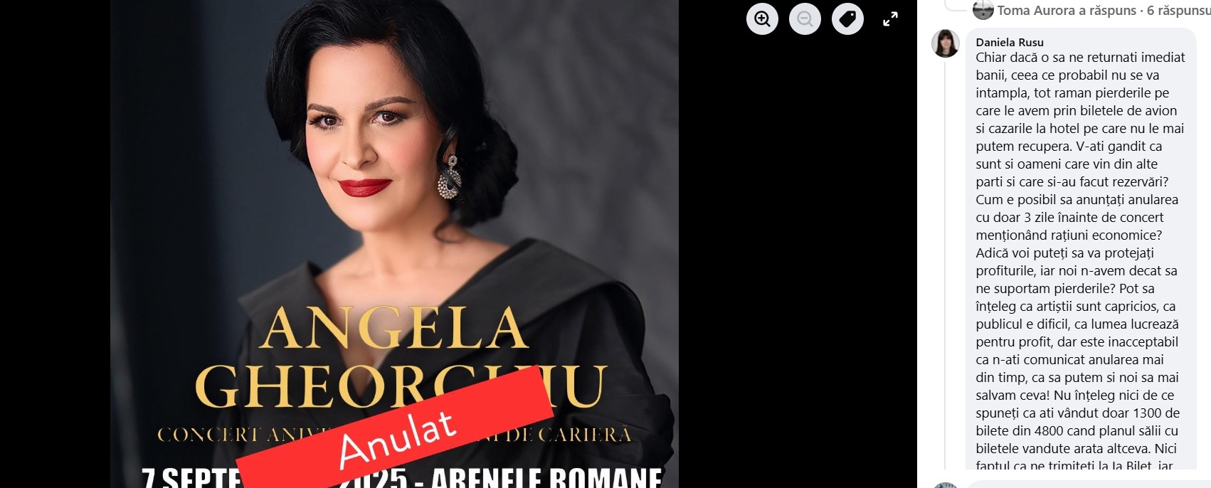 Comentariile celor ţepuiţi abundă şi umplu pagina de facebook şi nu sunt deloc dintre cele mai blânde, mai ales că oamenii au făcut eforturi ca să plătească biletele şi să ajungă să o vadă pe celebra soprană pe scena de spectacole din ţara sa natală.