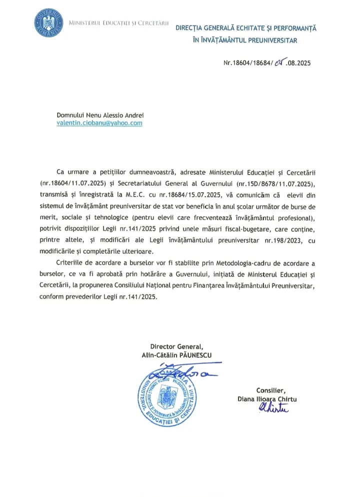 Răspunsul primit de Alessio Andrei Nenu, un adolescent de doar 15 ani din Ploiești, medaliat cu aur la Olimpiada Europeană de Geografie, de la Ministerul Educației, după scrisoarea trimisă de tânăr, în legătură cu tăierea burselor de performanță.