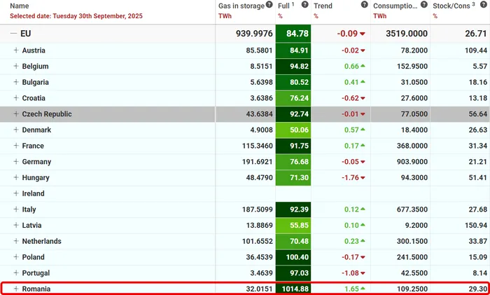 România a reușit să umple integral depozitele de gaze naturale, atingând 100% din capacitate cu o lună înainte de termenul limită stabilit de Uniunea Europeană – 31 octombrie. Potrivit datelor centralizate de la operatorii europeni, doar România și Polonia au atins deja pragul maxim de umplere, în timp ce media la nivelul UE este de 85%.