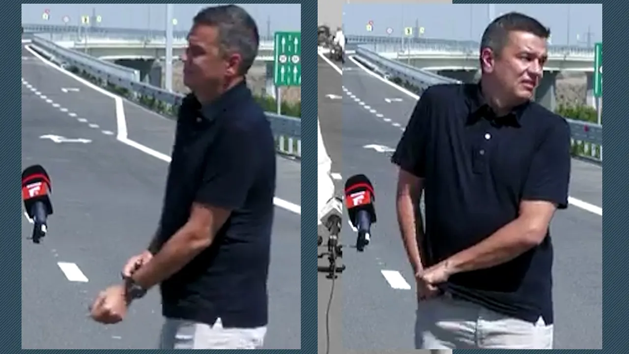 Sorin Grindeanu și-a scos ceasul de la mână în timpul unei conferințe de presă pe șantierul A0 Sud, după ce spusese câteva cuvinte introductive, în timpul declarației premierului Marcel Ciolacu.