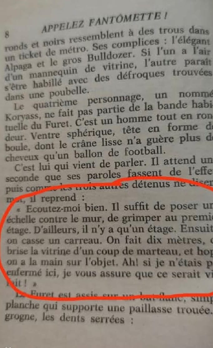 „Ascultă-mă bine! Fii atent! E suficient să agăţi o scară de perete, ca să ajungi la primul etaj. În definitiv, e vorba doar despre etaj. Apoi, spargi fereastra. Mergi 10 m, spargi vitrina cu o lovitură de ciocan şi gata! Pui mâna pe obiect. Dacă nu eşti reţinut de ceva, te asigur că vei pleca foarte repede de-acolo” , povesterşte autorul în cartea sa pentru copii.