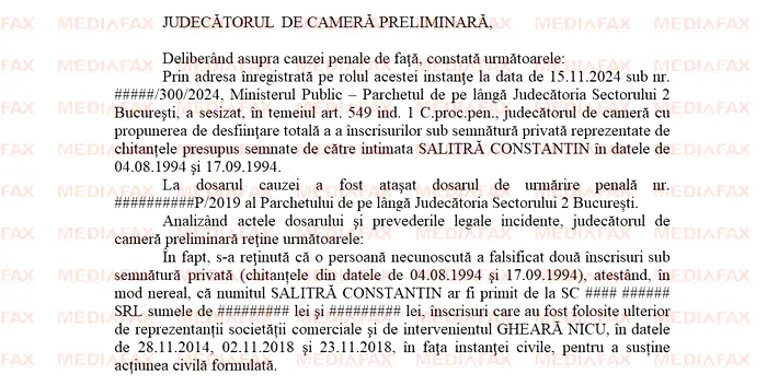 Procurorii au solicitat însă instanței desființarea oficială a chitanțelor, conform articolului 549¹ din Codul de procedură penală. Judecătorul de cameră preliminară a admis cererea și a dispus anularea definitivă a actelor falsificate.