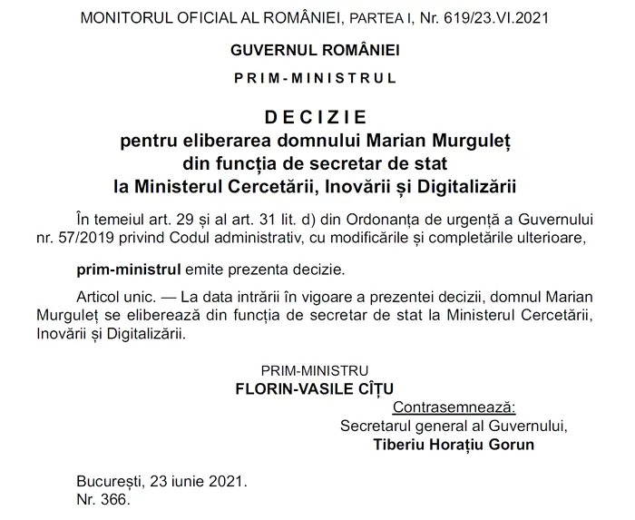 Monitorul Oficial a publicat, marți, 22 iunie, decizia de numire a lui Marian Murguleț ca secretar de stat în Ministerul Cercetării, Inovării şi Digitalizării, aflat sub conducerea lui Ciprian Teleman. Miercuri, 23 iunie, Monitorul Oficial a publicat eliberarea din funcție a lui Murguleț.