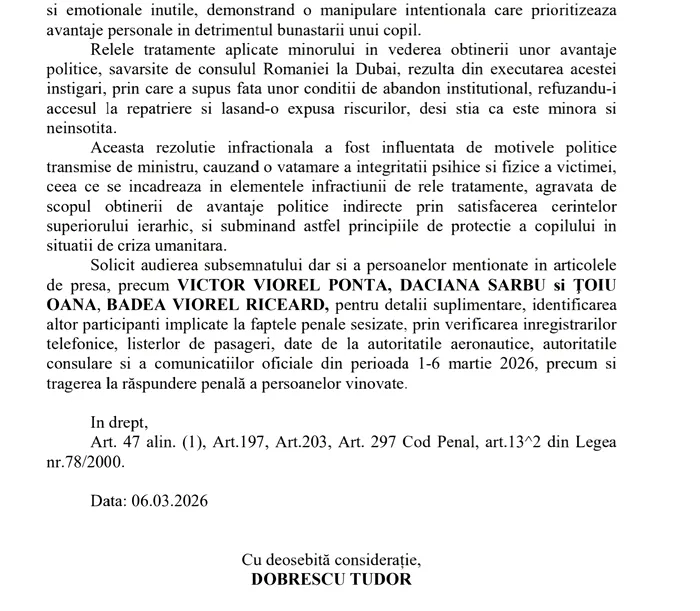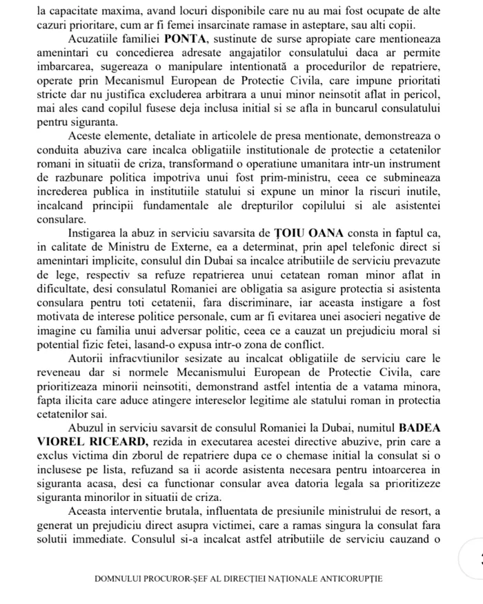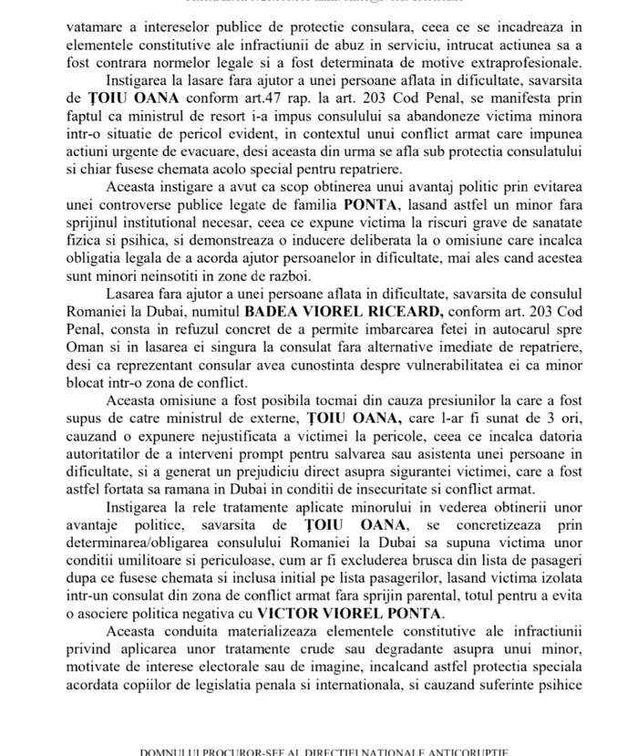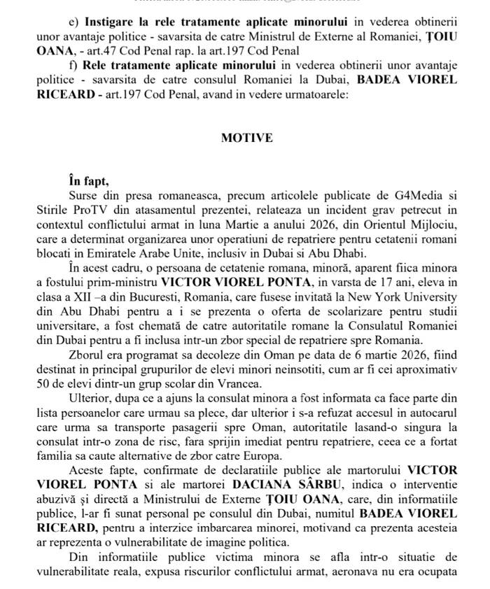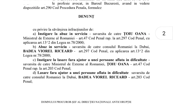 Denunțul a fost formulat împotriva ministrei Oana Țoiu și a consulului general al României la Dubai, Viorel Riceard Badea. Cei doi sunt acuzați de săvârșirea infracțiunilor de abuz în serviciu și lăsarea fără ajutor a unei persoane aflate în dificultate.
